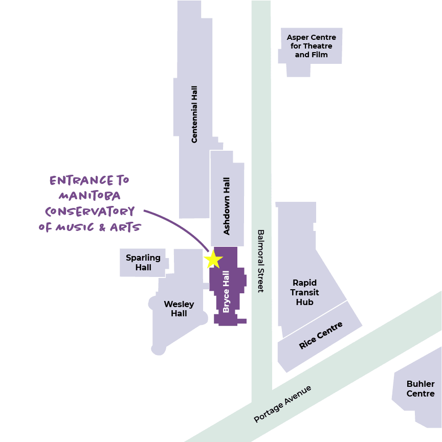 The Manitoba Conservatory of Music & Arts is located at the University of Winnipeg in Bryce Hall (515 Portage Avenue). Bryce Hall is the building where the chapel is located–directly east of Wesley Hall (the “castle” building). The entrance to Bryce Hall is off the walkway between Wesley Hall and Bryce Hall.